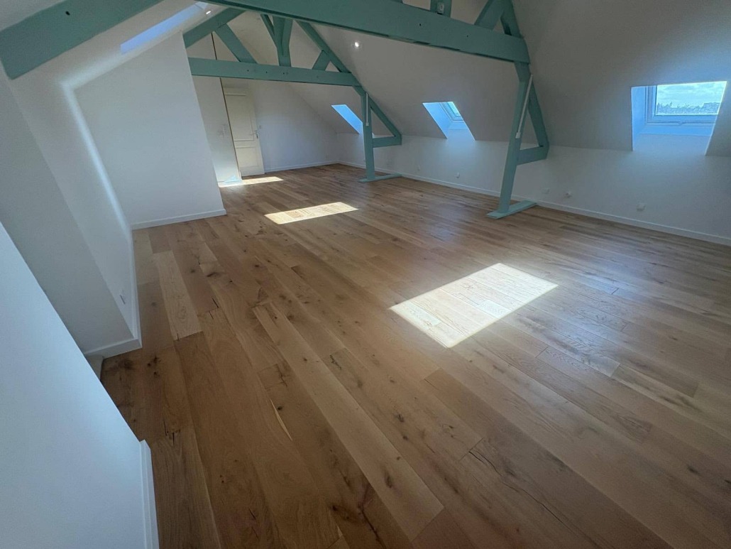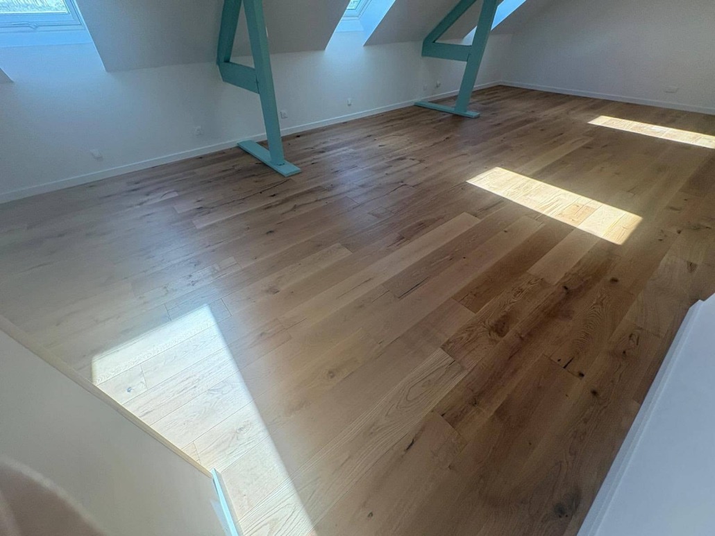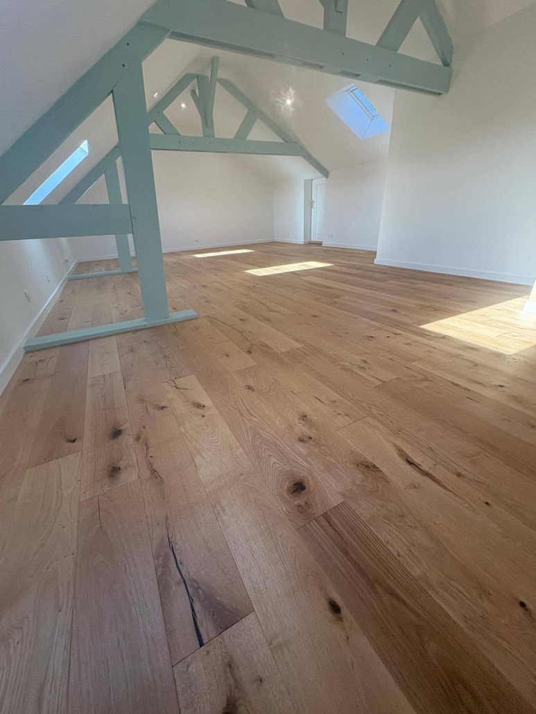 Mise en œuvre d’un parquet en chêne naturel à l’aspect chaleureux, avec une finition huilée extra rustique qui met en valeur le caractère authentique du bois.