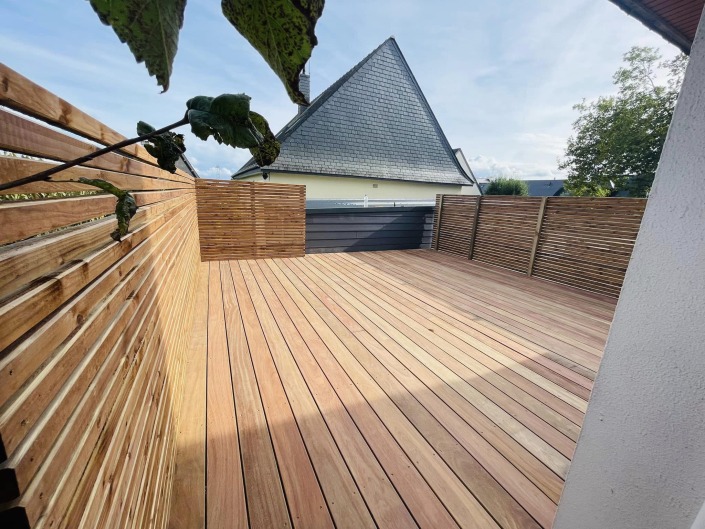 🪚⚒️🪜🪓 : Réalisation d’une Terrasse Perchée 🦍 – Ossature en Pin des Landes Brun🌲🪵 – Gardes corps et Claire Voie – 2 Escaliers d’accès – Lames de terrasse en Bois exotique Cumaru Rouge🌴🇧🇷 🟥 – Merci à M. & Mme D. pour leur confiance 😁👌