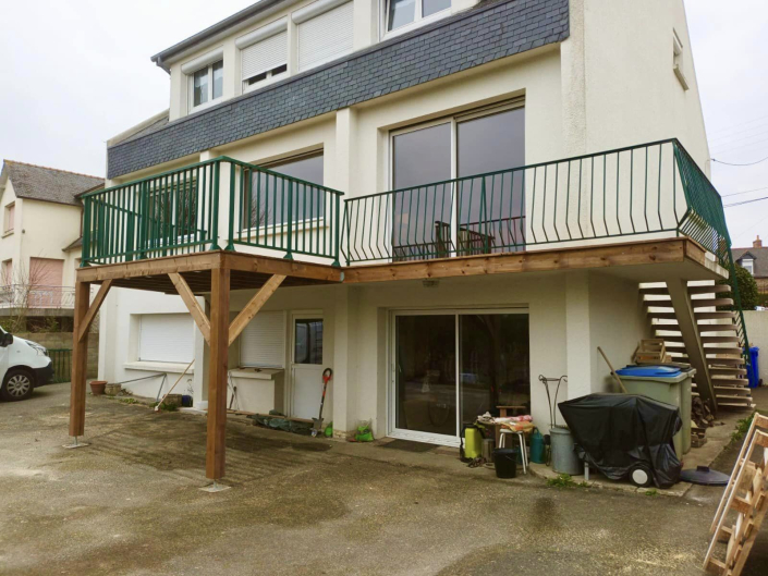 🚧 ⚒🪚 Réalisation d’une terrasse sur pilotis Pin des Landes Brun 🌲 en prolongement de balcon & pose d’un gardes corps Aluminium de chez Kostum – portails, clôtures et garde-corps fourni par Bochet (SAS) – Beau travail des charpentiers 👏👌
